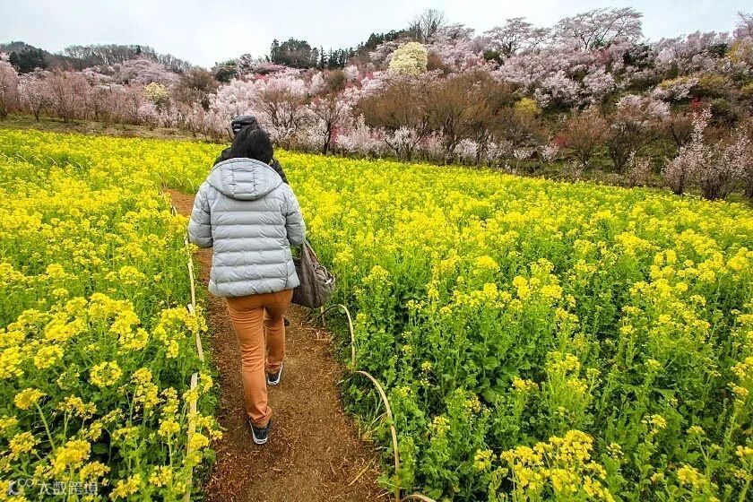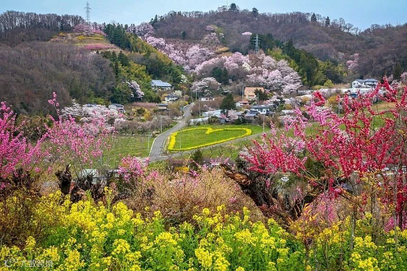 其中花见山的樱花是福岛不可错过的绝佳赏樱地。这里能欣赏梅花、花桃、东海樱、彼岸樱与连翘花等花卉与油菜花田共演而成的美丽景致。