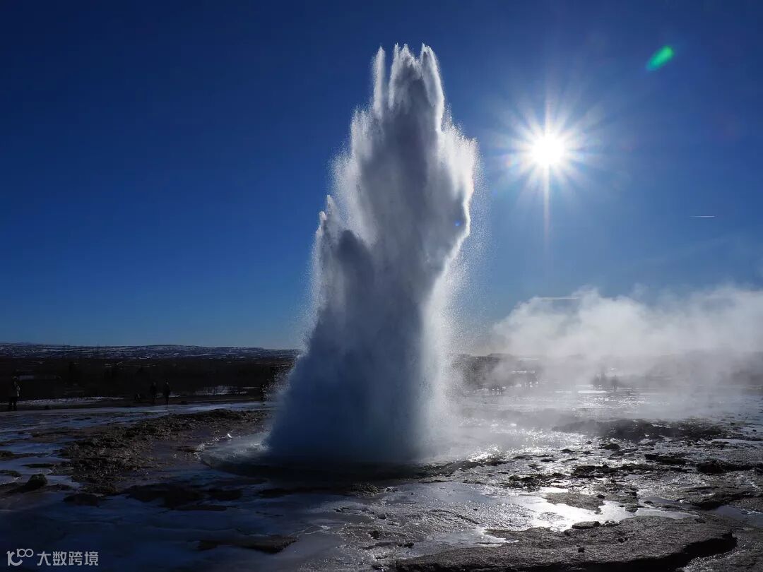 其不远处的斯特罗库尔间歇泉,约每隔8分钟左右连续喷射二、三次,水柱高达二十米,同样十分壮观,是现在最火爆的景点。