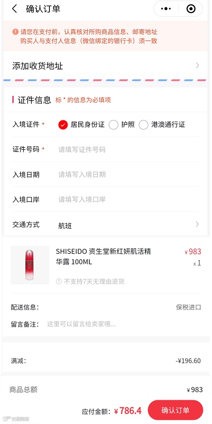 在cdf会员购小程序搜索 资生堂新红妍肌活精华露 ,点击立即购买,进入如下图所示的确认订单页面: