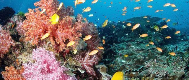这里,水下更有童话世界,各色珊瑚七彩斑斓,成千上万的热带鱼如同烟花沸然四溅,亲亲密密拂过潜水。