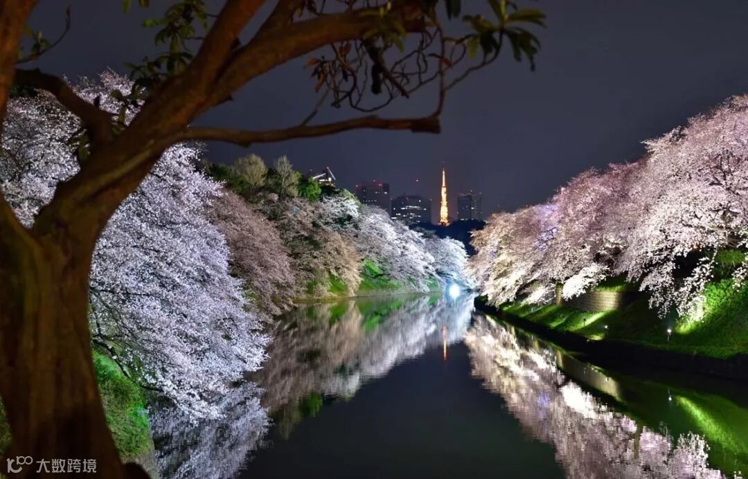 夜樱景色更是值得期待,樱花周围打上灯光,水面上能够倒映出樱花的姿态,如同海市蜃楼一般,美艳不可方物。