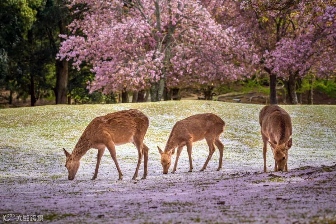 奈良公园是小鹿聚集地,在这里可以看到各种可爱的小鹿,在樱花树下,可以与小鹿互动,喂它们吃鹿饼,跟他们一起欢乐赏樱。
