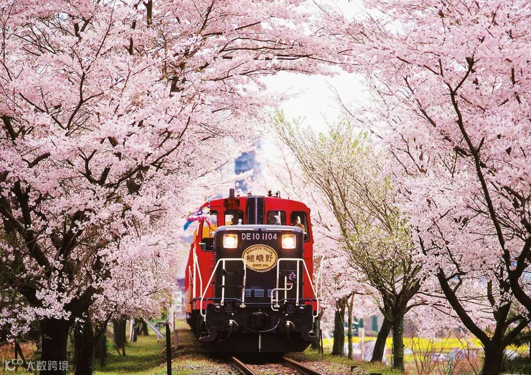 坐在嵯峨野小火车上,慢慢穿过樱花隧道,是岚山最具人气的赏樱方式。