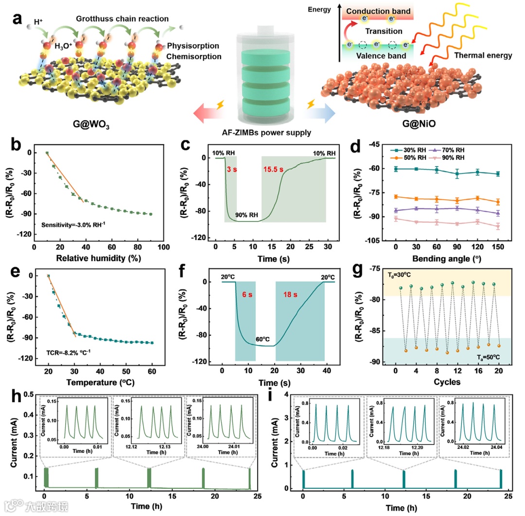 温度传感器(G@NiO)走的是热激活机制——温度高,载流子多,电阻低。图4e-g里,电阻温度系数(TCR)-2.4% °C⁻¹,峰值能到-8.2% °C⁻¹。响应/恢复时间6/18秒,30°C和50°C来回切换,信号可重复。