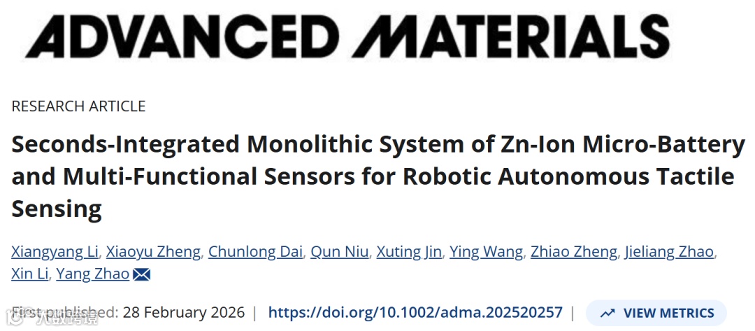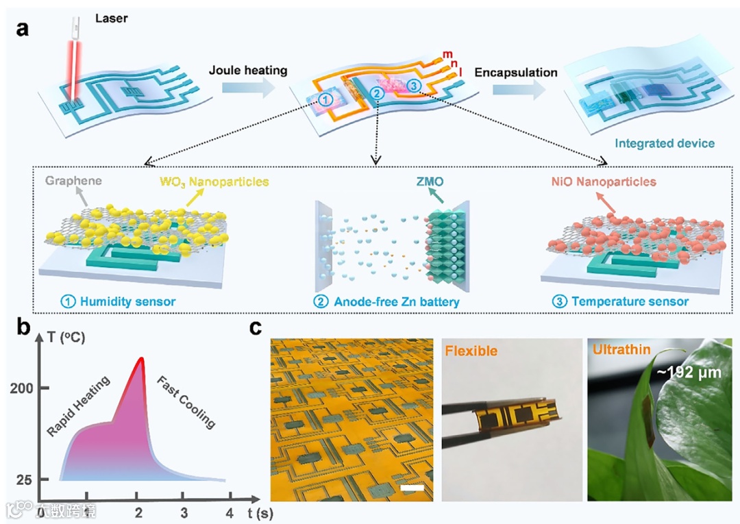 北京理工大学赵扬团队最近在《Advanced Materials》上发了一篇,直接把问题从根上解决了。他们用焦耳热技术,8秒之内,在同一片石墨纸基底上,一键合成了锌离子微电池和温湿度传感器。不是拼起来,是长在一起。