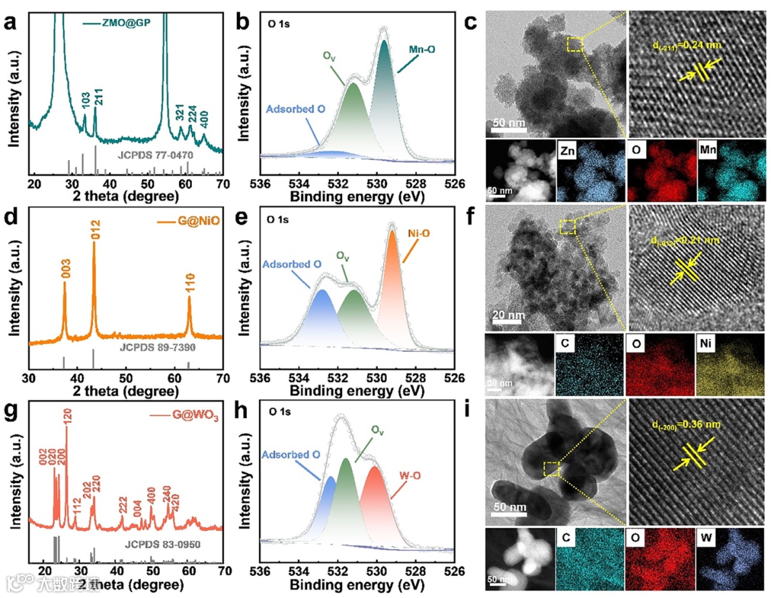 HRTEM(图2c,h,i)更直观:ZMO的(211)晶格间距0.24 nm,NiO的(012)是0.21 nm,WO₃的(200)是0.36 nm,元素分布均匀。