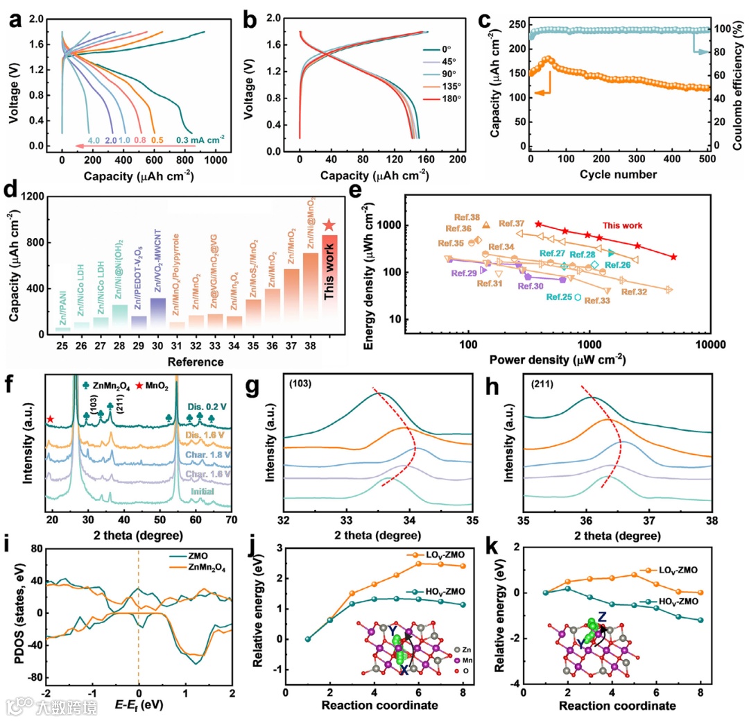 为什么倍率性能好?图3i-j的DFT计算给了答案:氧空位让Zn²⁺在ZMO体相内的迁移能垒从2.5 eV降到1.3 eV,表面迁移能垒从0.48 eV降到0.18 eV。离子跑得快,倍率自然高。