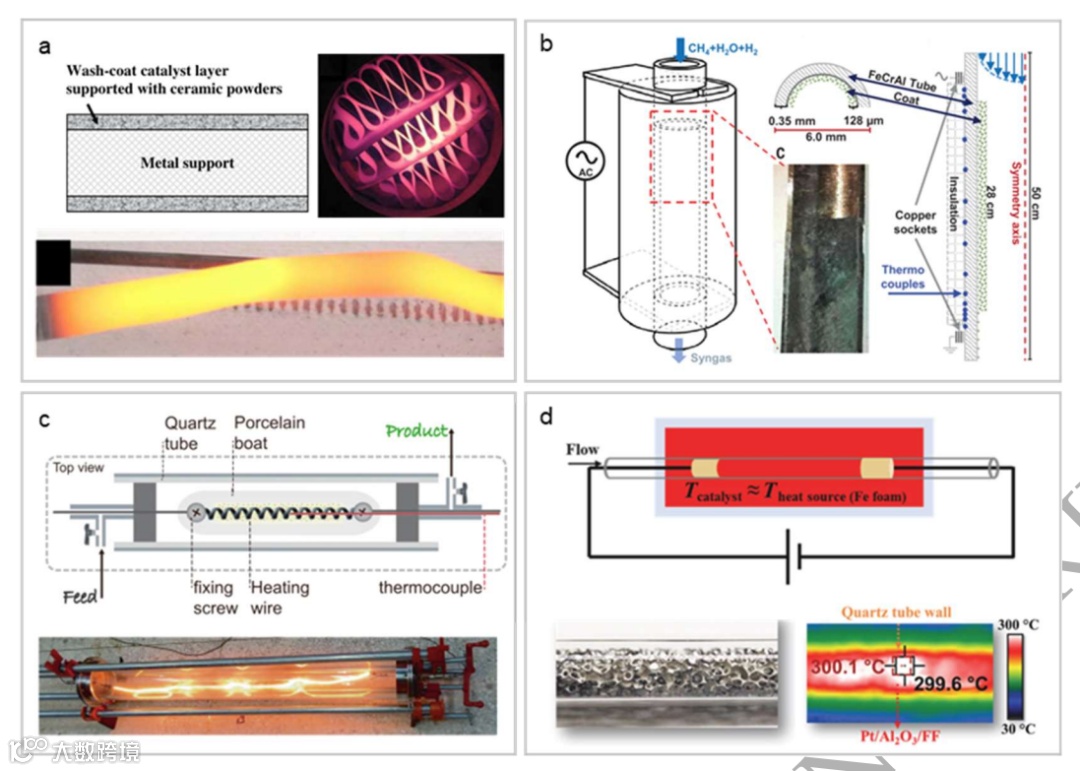 👉 图1展示了金属载体的电热催化应用:板式、管式、丝状及泡沫金属载体。这些载体利用焦耳热实现快速启动与高效热传递,如FeCrAl管式反应器用于甲烷蒸汽重整,其紧凑设计可使CO₂排放降低1%。但金属载体存在连接点能耗大、涂层易脱落、耐腐蚀性差等局限性。