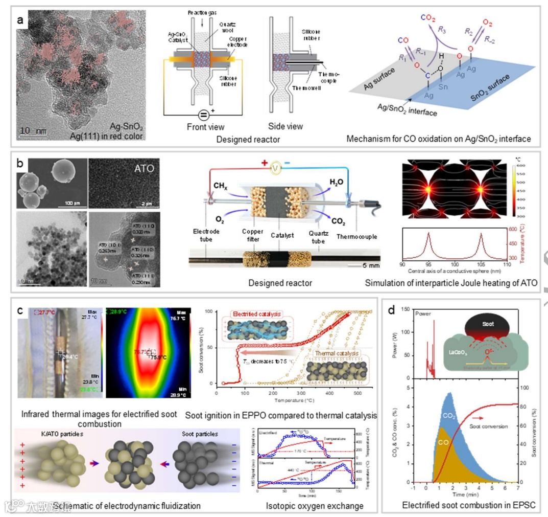 👉 图3展示了堆积型颗粒间导电催化剂在污染物氧化中的应用。以Ag-SnO₂、ATO、LaCoO₃等粉末催化剂为例,电流直接流经颗粒接触点。数值模拟显示,接触点“热点”温度(~600°C)远高于颗粒主体(~300°C)。在炭烟燃烧中,电动力学流化改善固-固接触,电驱动晶格氧释放使T₅₀降至75°C以下或半分钟内完全燃烧。