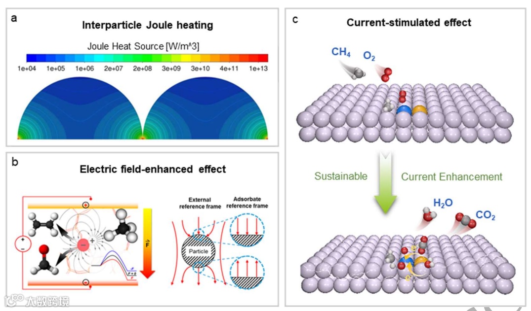 颗粒间:电流直接流经反应物,除了焦耳热,还引入了电促进效应——电流诱导的电场、电子注入、晶格氧活化等,直接降低反应能垒,改变催化路径。