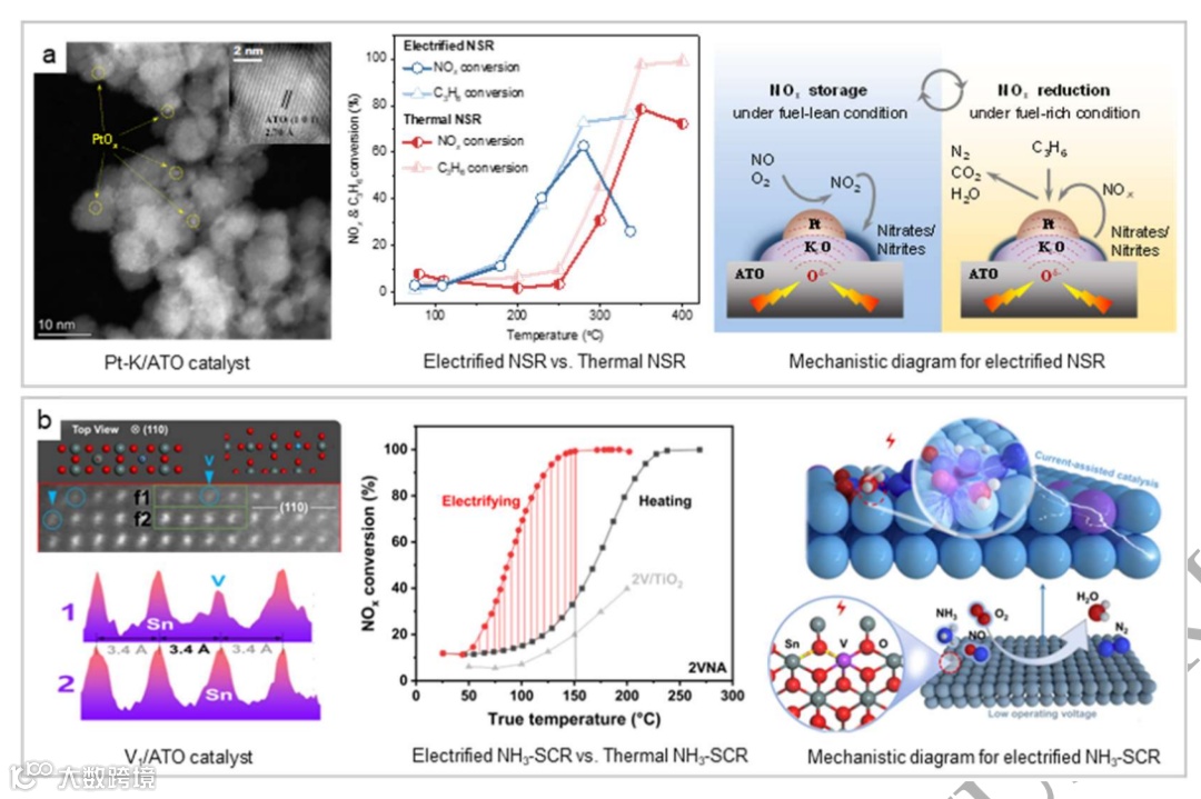 👉 图4展示了ATO基催化剂的NOₓ电热去除。Pt-K/ATO用于NOₓ存储还原(NSR),施加0.5-4 W电功率使起燃温度降低100°C,能效提升23%。V₁/ATO用于NH₃-SCR,在电流作用下实现超低温完全NOₓ转化,原位XPS与DRIFTS揭示“电子剪刀效应”削弱V-O键,加速氧循环。