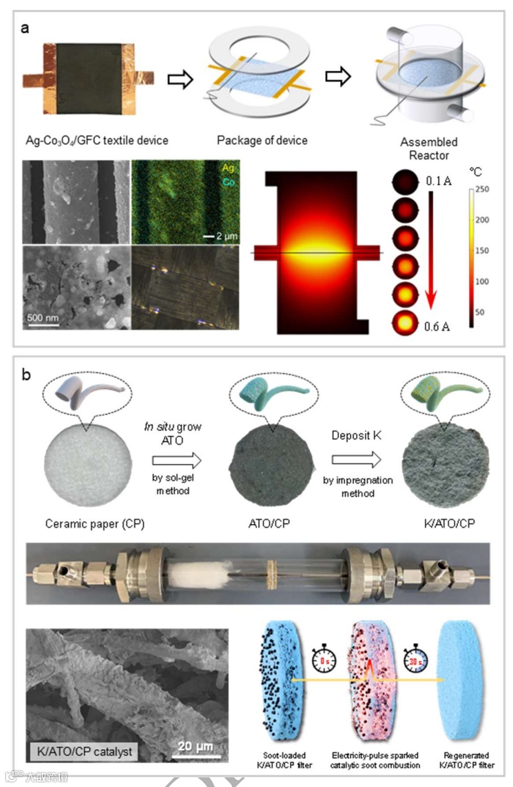 👉 图6展示了涂覆型颗粒间导电催化剂。将导电催化剂涂覆于绝缘整体材料(玻璃纤维布、陶瓷纸)上,形成连续导电网络。Ag-Co₃O₄/玻璃纤维布在<20V下甲醛转化率较传统加热高3倍,节能>90%;K/ATO/陶瓷纸结合电脉冲火花催化(EPSC),半分钟内完成炭烟燃烧,热量局域化保障安全。