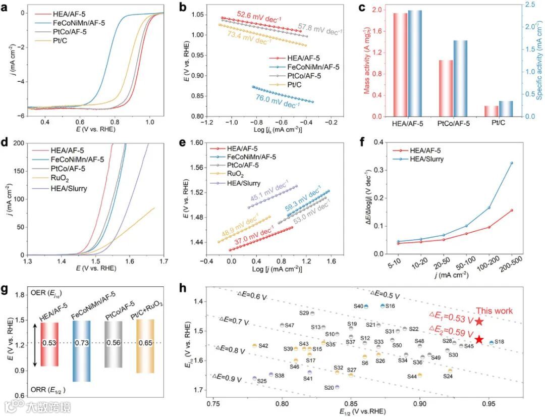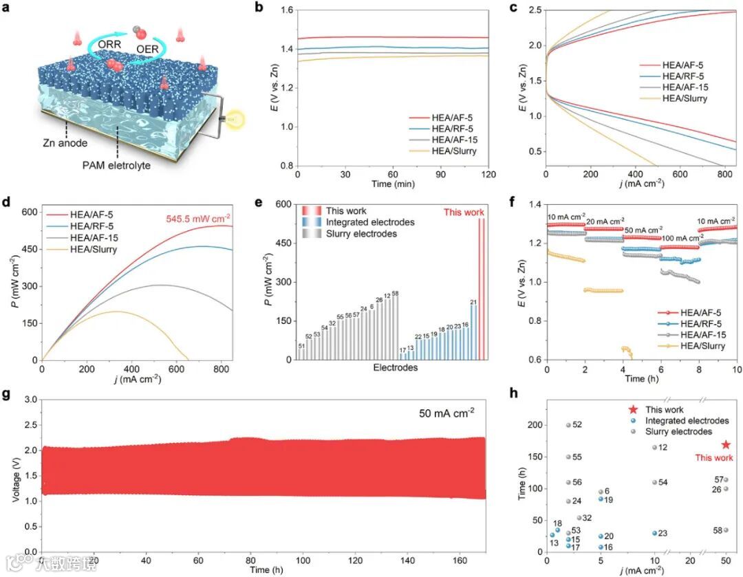 在氧还原反应中,电极表现出0.94 V的半波电位,优于传统Pt/C催化剂;在氧析出反应中,10 mA cm⁻²电流密度下的过电势仅为241 mV。其双功能活性指标ΔE值达0.53 V,处于领域领先水平,展现了高熵合金多元素协同效应的优势。