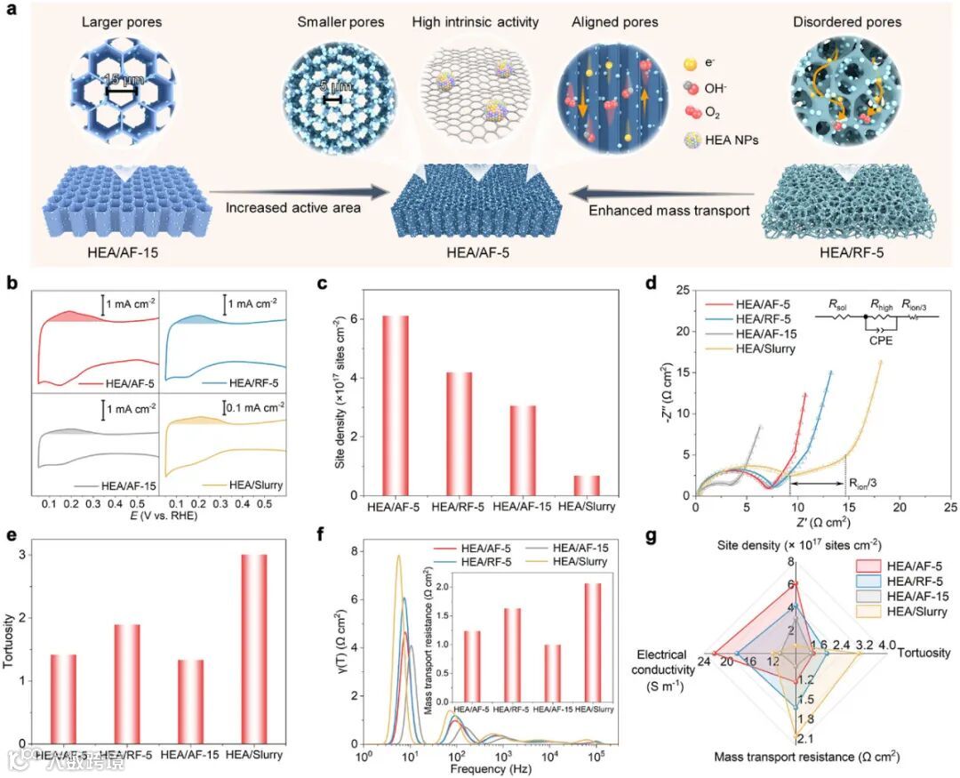 研究表明,电极的高性能源于其独特的结构设计:垂直排列的孔道结构显著降低了传输阻力(曲折度τ=1.42),而高密度活性位点(6.1×10¹⁷ sites cm⁻²)与高电子电导率(22.2 S m⁻¹)的协同作用确保了反应的高效进行。