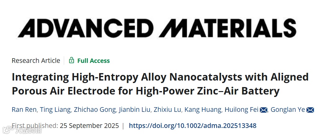锌空气电池商业化进程因功率密度不足而受阻。湖南大学费慧龙、叶龚兰团队在Advanced Materials上发表突破性研究成果,通过焦耳热瞬态合成技术(1280°C, 0.3秒) 成功制备出高熵合金一体化电极,助力准固态锌空气电池实现545.5 mW cm⁻²的峰值功率密度,刷新了该领域的性能纪录。