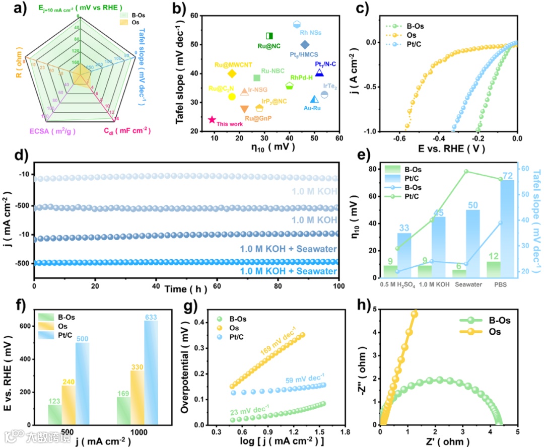 超性能:7 mV@10 mA cm⁻²(碱性海水),1 A cm⁻² 仅 196 mV,Tafel 23 mV dec⁻¹。