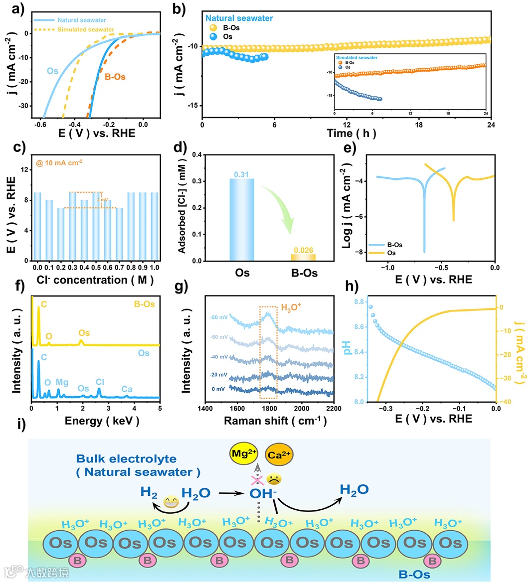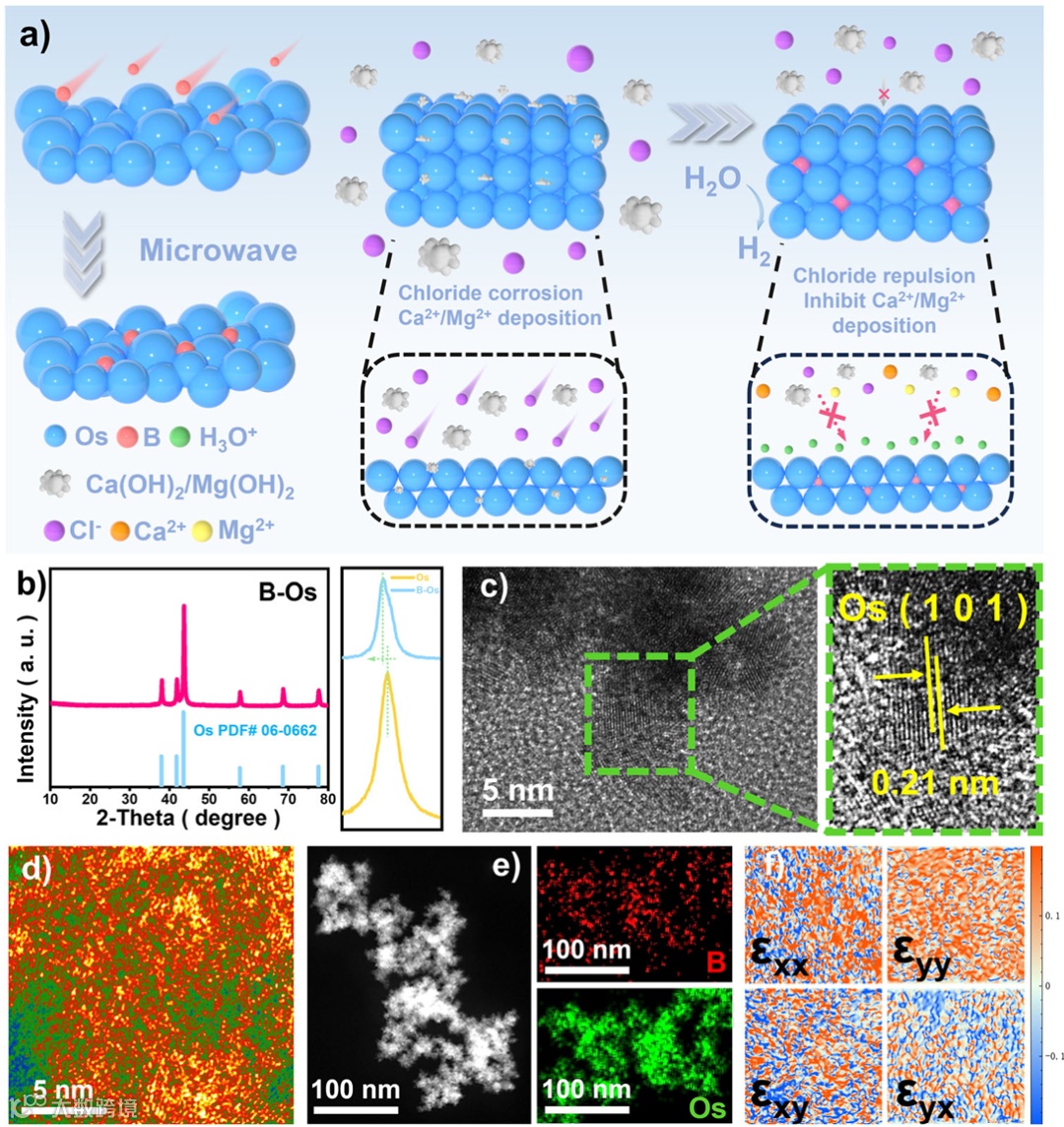 微观设计:B 嵌入 Os 晶格间隙,电子云富集 → 形成局部酸性微环境,Cl⁻ 被静电排斥,Ca²⁺/Mg²⁺ 无法沉积。