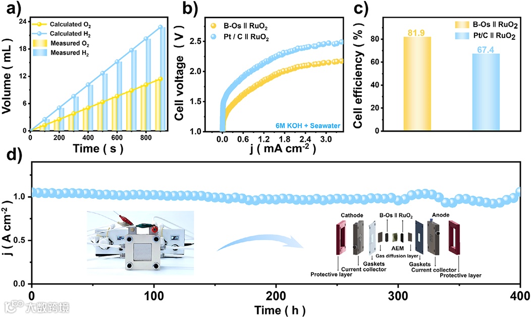 • AEM 电解槽:B-Os∥RuO₂ 仅需 1.43 V@10 mA cm⁻²;500 mA cm⁻² 能量效率 81.9 %。