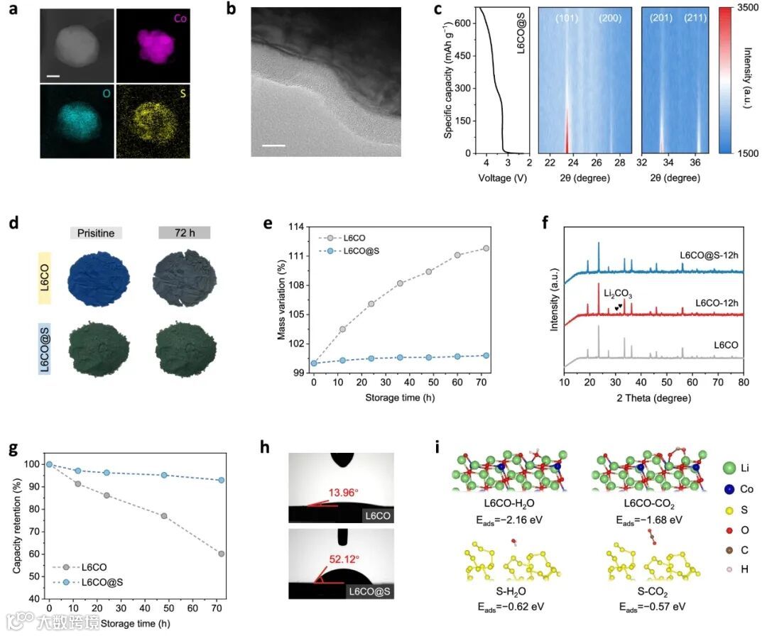 通过低温热处理,在L6CO颗粒表面构建了均匀的非晶硫包覆层(约20 nm)。该包覆层极大改善了材料的空气稳定性:在30%湿度空气中暴露72小时后,未包覆样品严重碱化,容量骤降;而包覆样品质量变化微小,容量保持率超过92%。接触角测试和理论计算表明,硫层显著增强了材料疏水性,并大幅降低了水分子和二氧化碳在其表面的吸附能,从而从物理和化学层面阻隔了降解反应。
