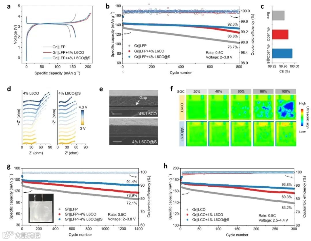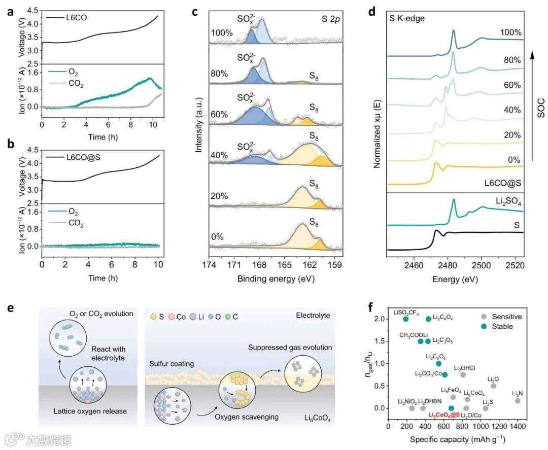 在线电化学质谱分析直观显示,未包覆的L6CO在充电时会释放氧气和二氧化碳,而硫包覆样品则几乎完全抑制了所有气体析出。通过X射线吸收谱等分析发现,充电过程中,包覆层中的单质硫被氧化为稳定的硫酸根,这一过程“捕获”了正极脱锂时释放的活性晶格氧,将其转化为热力学更稳定的硫酸锂,从而从根本上消除了氧气释放的根源。