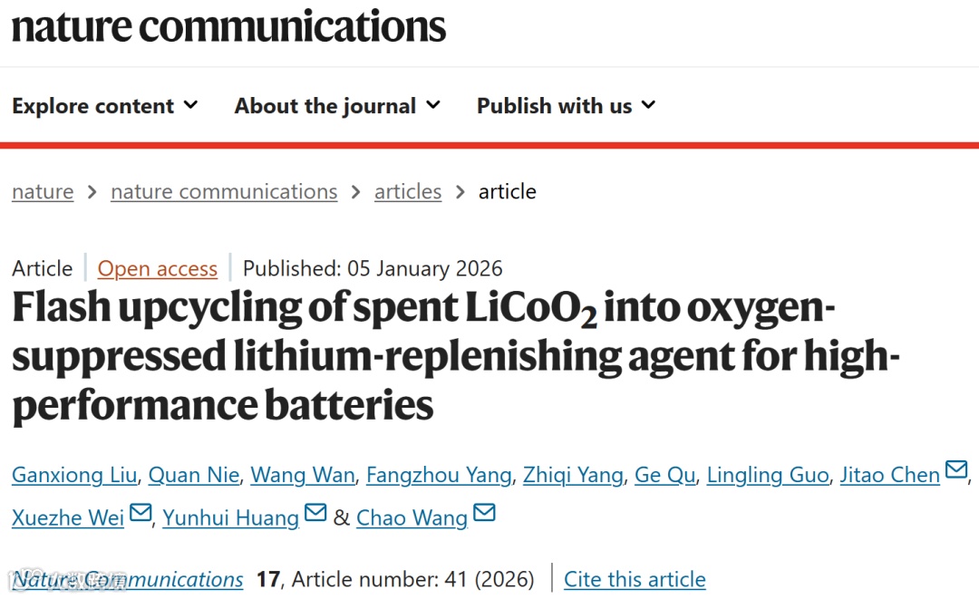 Ganxiong Liu, Quan Nie, Wang Wan, et al. Flash upcycling of spent LiCoO₂ into oxygen-suppressed lithium-replenishing agent for high-performance batteries. Nat. Commun. 17, 41 (2026).