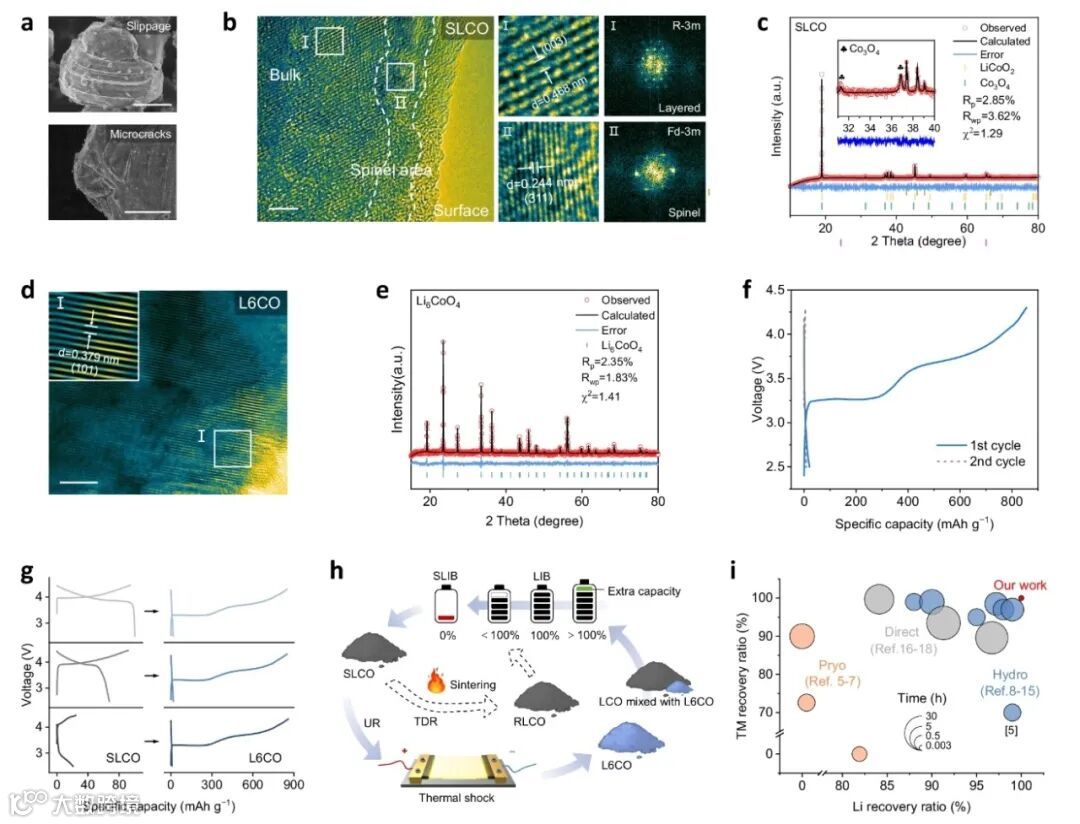 透射电镜显示,废旧LCO存在严重的层状结构滑移与表面相变。研究采用闪蒸焦耳加热技术,将其与氧化锂混合,在10秒内快速、完全地转化为纯相Li₆CoO₄。电化学测试表明,该材料具有约3.2 V的适宜分解电位和高达856 mAh g⁻¹的补偿容量,且对不同劣化程度的废料均表现出一致的性能,普适性极强。该过程巧妙利用电极残留的碳和粘结剂作为还原剂,实现了锂、钴元素的近100%回收。