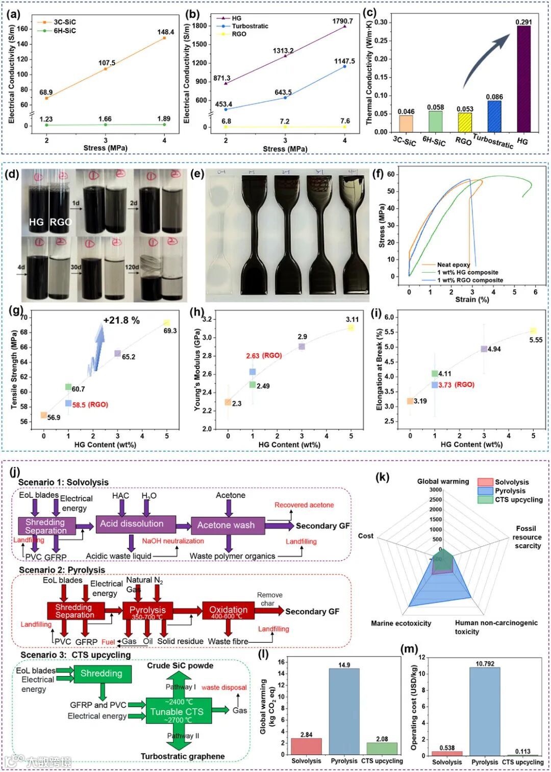 涵盖电导率、热导率、分散稳定性及力学增强效果等关键指标,其中图4f-g显示添加5wt.%杂化石墨烯使环氧树脂拉伸强度显著提升21.8%。