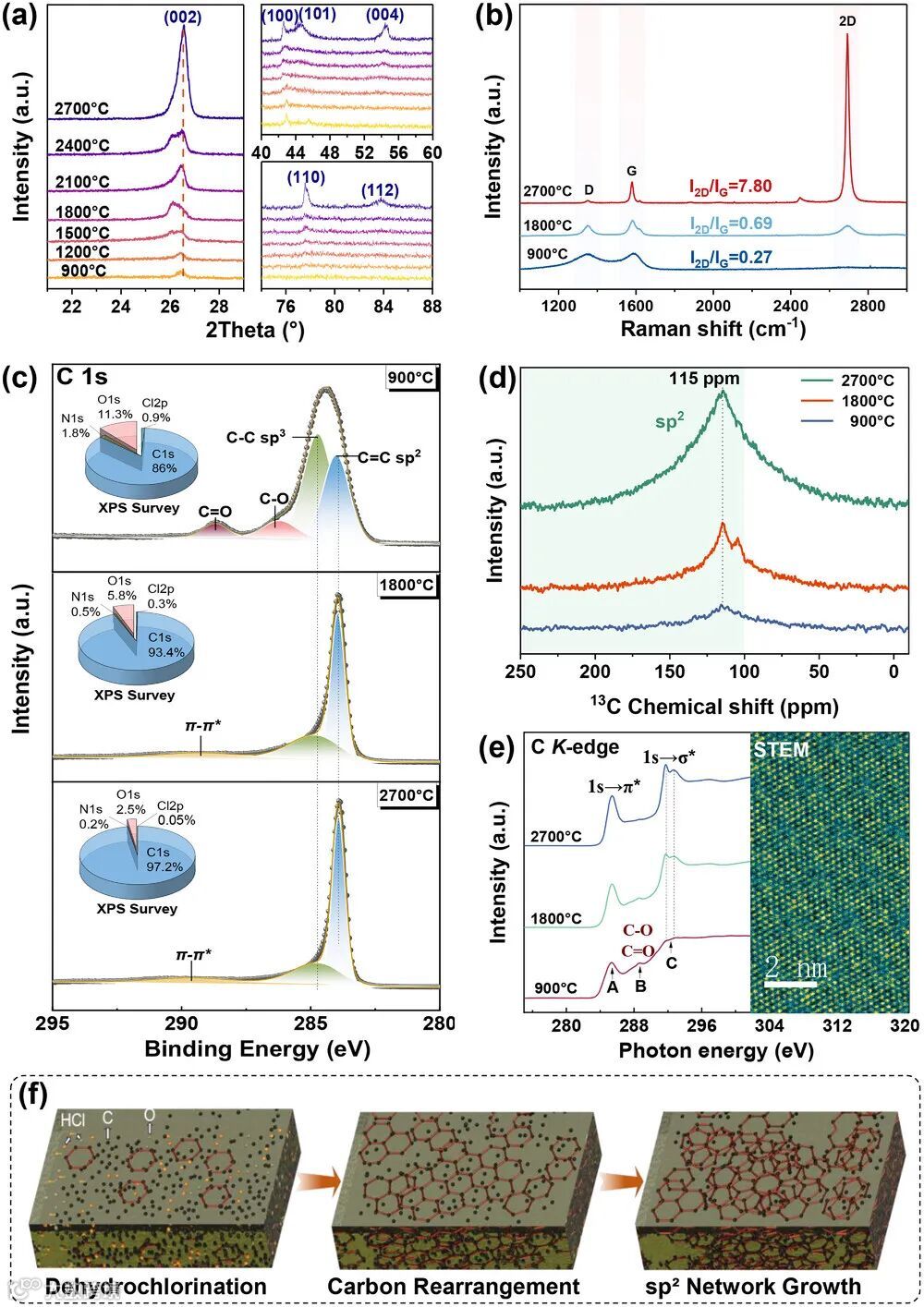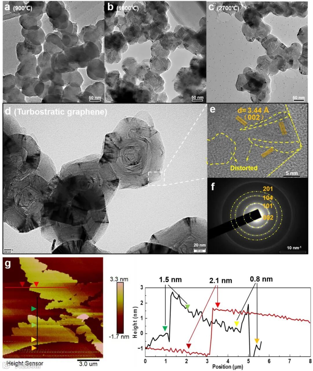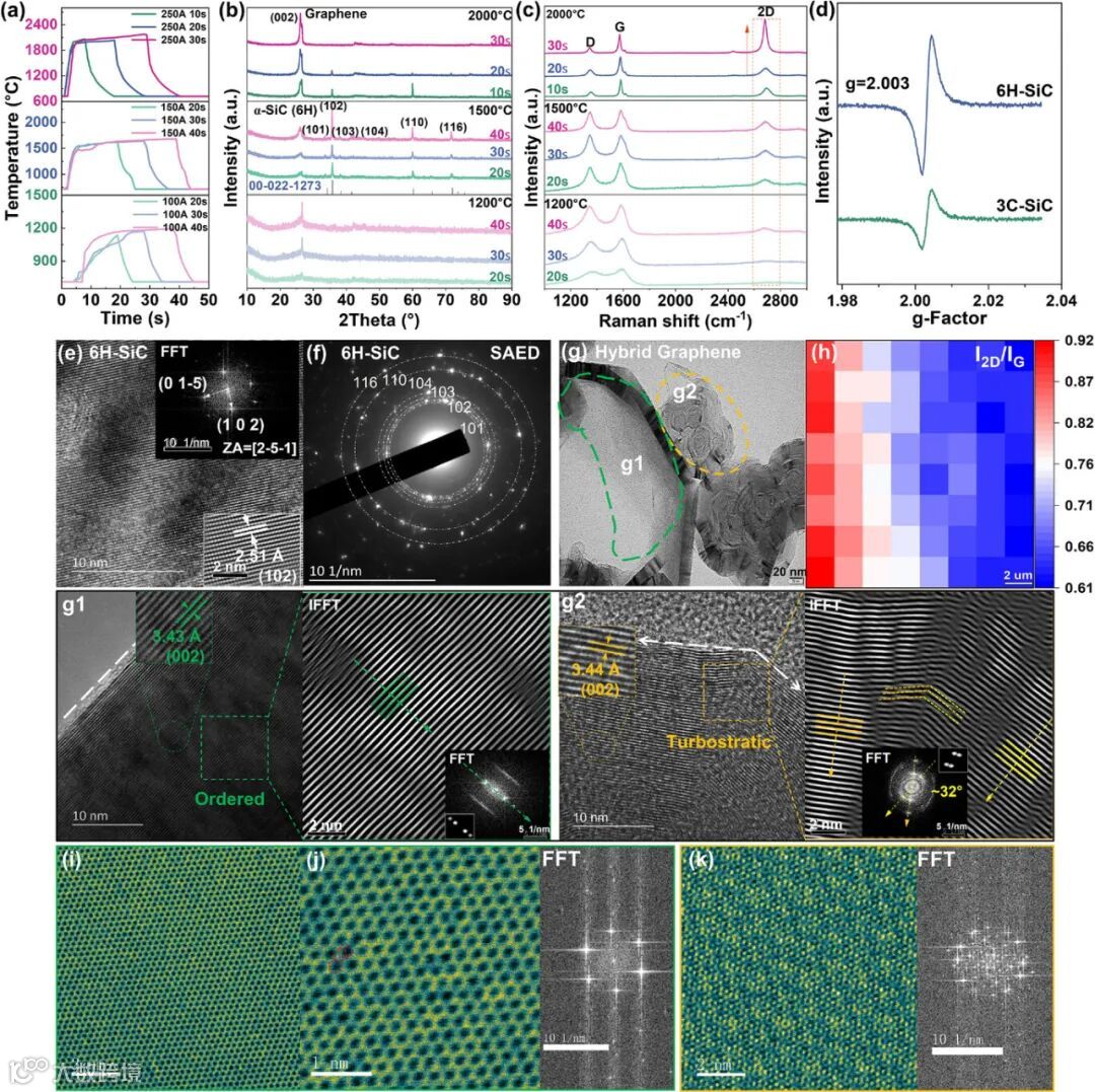 通过高分辨电镜图像(图2e-f)展示了选择性合成的6H-SiC的完美晶体结构,而图2g-j则直观呈现了混合石墨烯中AB堆叠与涡轮层纳米域共存的独特结构。这些原子级表征为理解材料优异性能提供了结构基础。