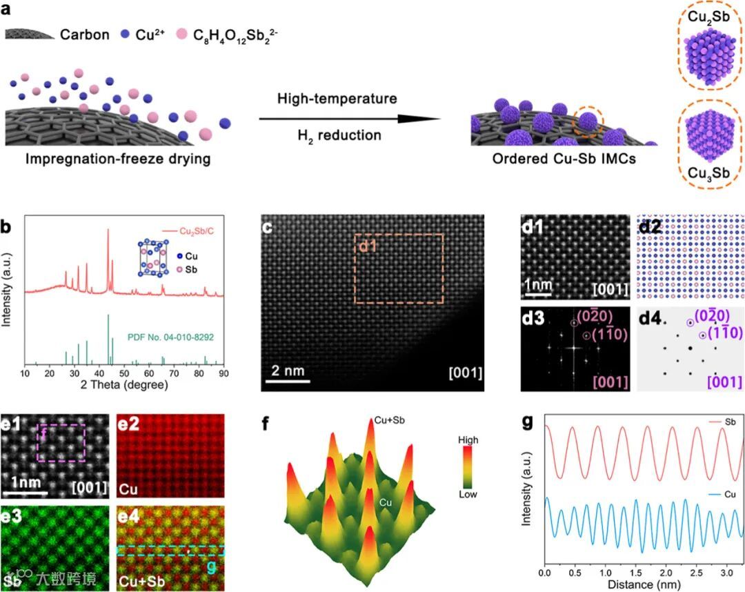 图2 的结构表征证实成功合成纯相四方晶系Cu₂Sb,原子分辨图像显示Cu与Sb原子有序交替排列,形成理想的金属间化合物结构。