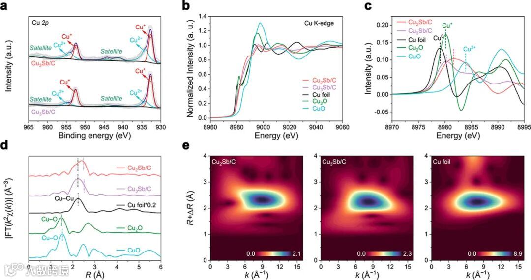 图3 的光谱分析揭示Cu₂Sb中同时存在Cu⁺与Cu²⁺物种,平均价态介于Cu₂O与CuO之间,确证混合价态特性。