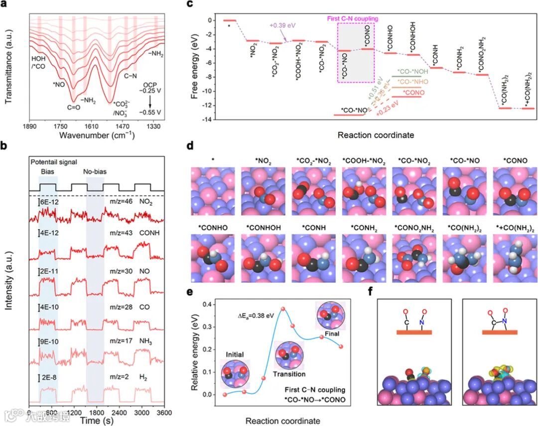 图5 的原位谱学与理论计算揭示了催化反应机制,C–N偶联能垒仅为0.23 eV,电子层面阐释了反应推动力。