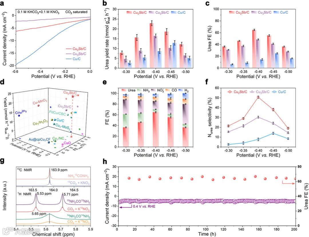 图4 的性能评估显示Cu₂Sb在-0.4 V时达到最优性能,同位素标记实验证实尿素来源于NO₃⁻与CO₂的共还原。