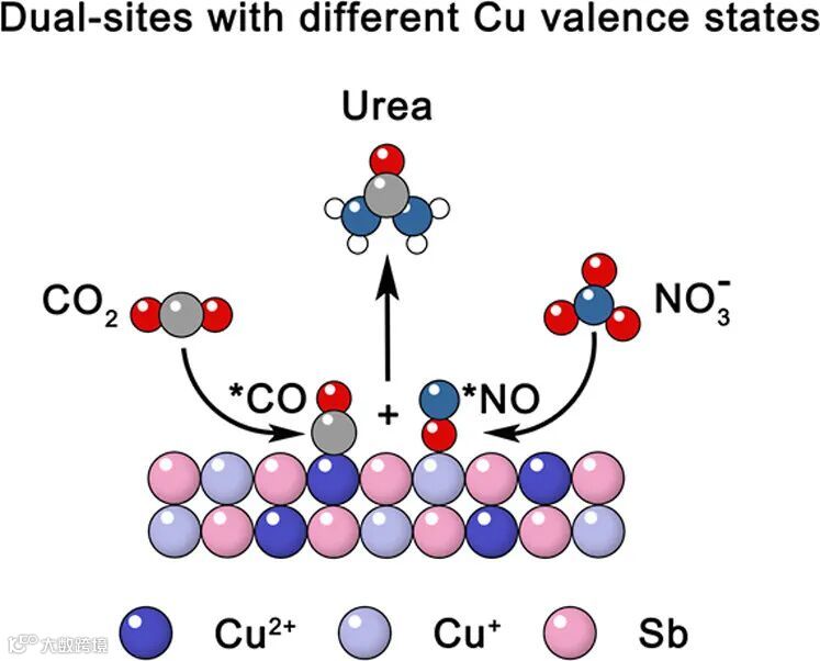 图1 展示了双位点设计策略,利用Cu²⁺稳定CO中间体、Cu⁺稳定NO中间体,通过空间邻近与电子协同降低C–N偶联能垒。