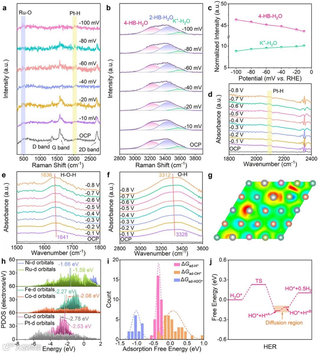 DFT计算 (图4g-j): 量化揭示了“解离(Ru)-扩散(FeCoNiCu)-结合(Pt)”协同路径的能垒优势(水解离能垒0.23 eV, H₂脱附能垒0.22 eV)。