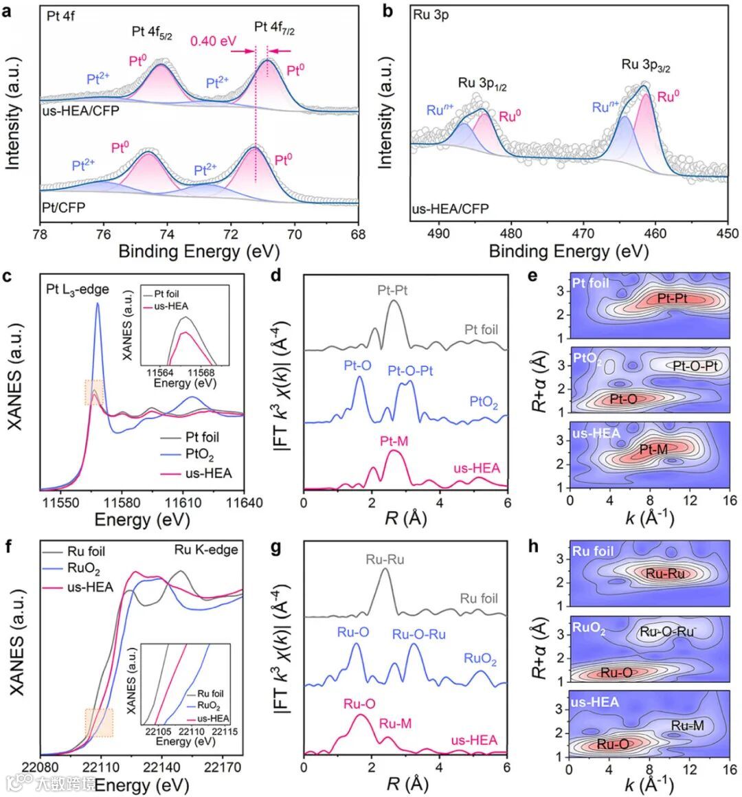 XPS(图2a,b)和XAFS(图2c,d,f,h)揭示了元素间显著的电子转移与配位环境变化(如Pt的电子富集,Ru的部分氧化),优化了反应中间体的吸附/脱附行为。