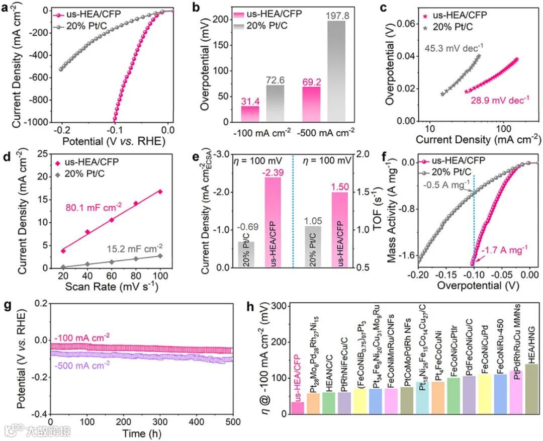 核心性能图 (图3a,b): 在碱性介质中,us-HEA/CFP 驱动 -1000 mA cm⁻² 电流密度仅需 102.5 mV 过电位,显著优于 商用Pt/C及文献报道的先进催化剂。