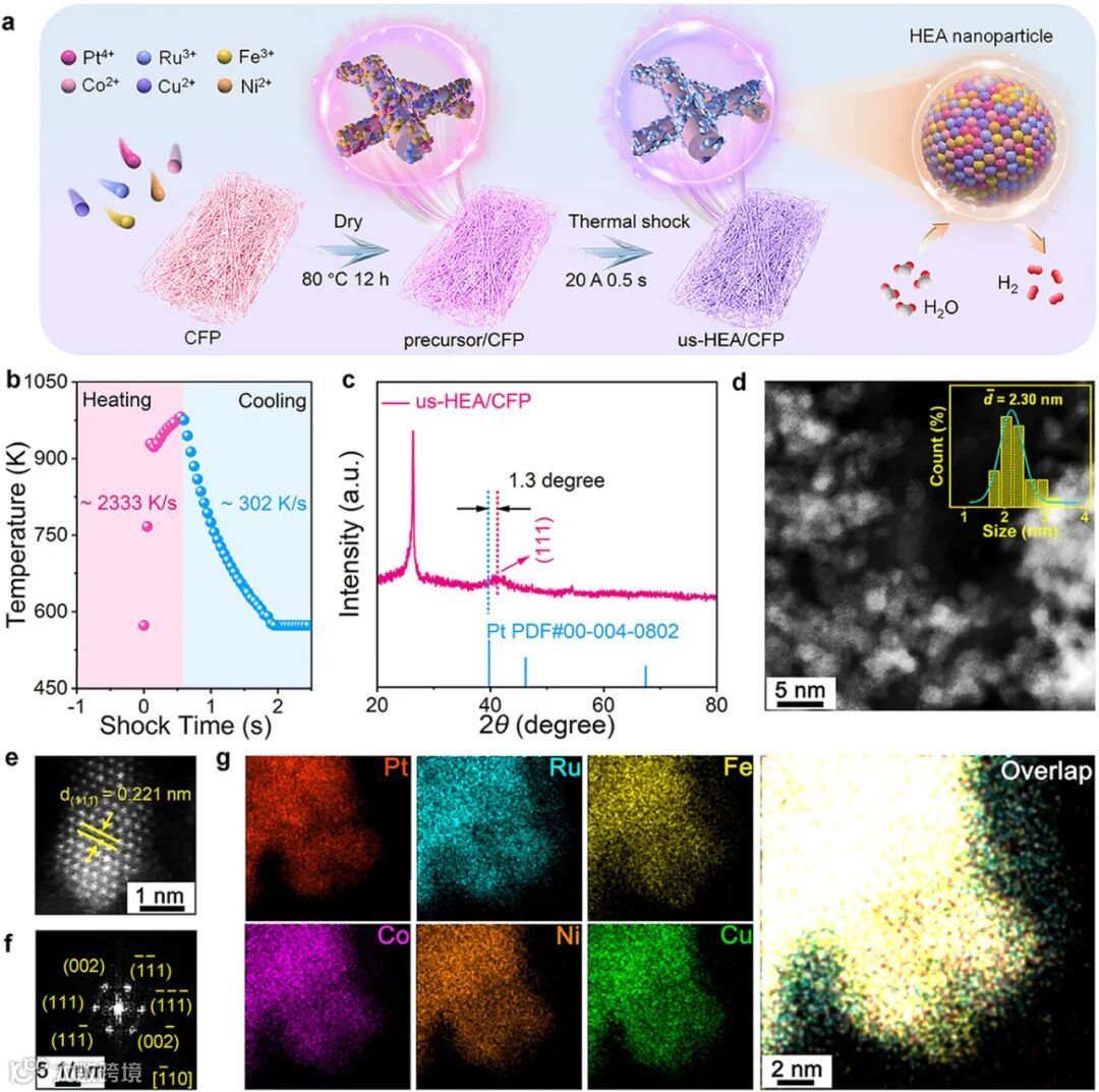 核心技术: 研究采用了具有超快升降温能力(升温速率 2333 K s⁻¹,图1b)的热冲击技术平台,这是实现亚3纳米均匀HEA合成的关键。