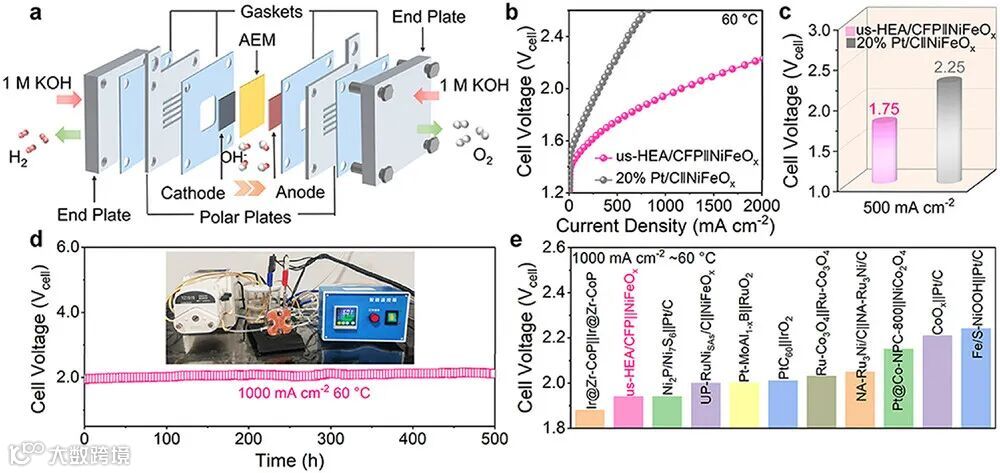 工业级验证: 组装的AEM电解槽仅需 1.94 V 槽压即可驱动 1000 mA cm⁻² 产氢电流,单位制氢成本估算降至 $0.86/kg(较基准降低约15.7%),并稳定运行500小时。