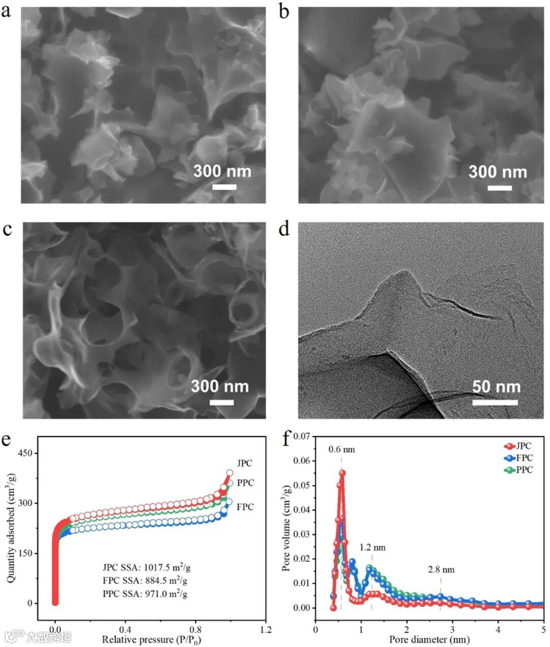 SEM图像(图2a-c)显示JPC具有均匀的片状多孔结构,TEM(图2d)进一步证实其发达的多孔网络。BET分析(图2e-f)揭示JPC具备高比表面积(1017.5 m²/g)和优化的微孔-介孔协同系统,为离子传输提供理想通道。