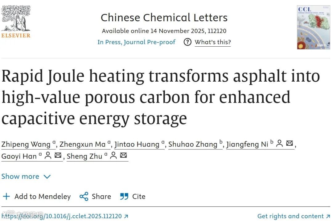 面对全球可持续储能器件的迫切需求,山西大学韩高义教授、朱胜副教授与苏州大学倪江锋教授团队在中科院一区TOP期刊《Chinese Chemical Letters》(2025年影响因子8.9)上发表创新研究成果。该研究通过熔盐辅助焦耳加热技术,在850°C下仅用8秒成功将廉价沥青转化为高性能多孔碳,攻克了传统方法能耗高、污染重、孔结构调控难的技术瓶颈。所制备材料比电容高达362.9 F/g,组装的超级电容器能量密度达26.7 Wh/kg,性能较传统材料提升3倍,为碳材料绿色制造与储能器件升级提供了颠覆性解决方案。