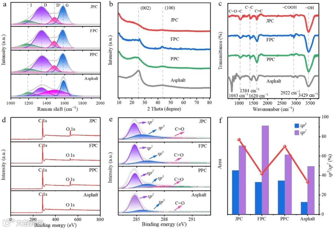拉曼光谱(图3a)中JPC的ID/IG=1.78,表明其具有高密度碳缺陷。XRD(图3b)显示(002)晶面间距扩大,利于离子嵌入。XPS分析(图3f)证实JPC具有高sp³/sp²比率,这些结构特性共同促进了电荷存储与传输。