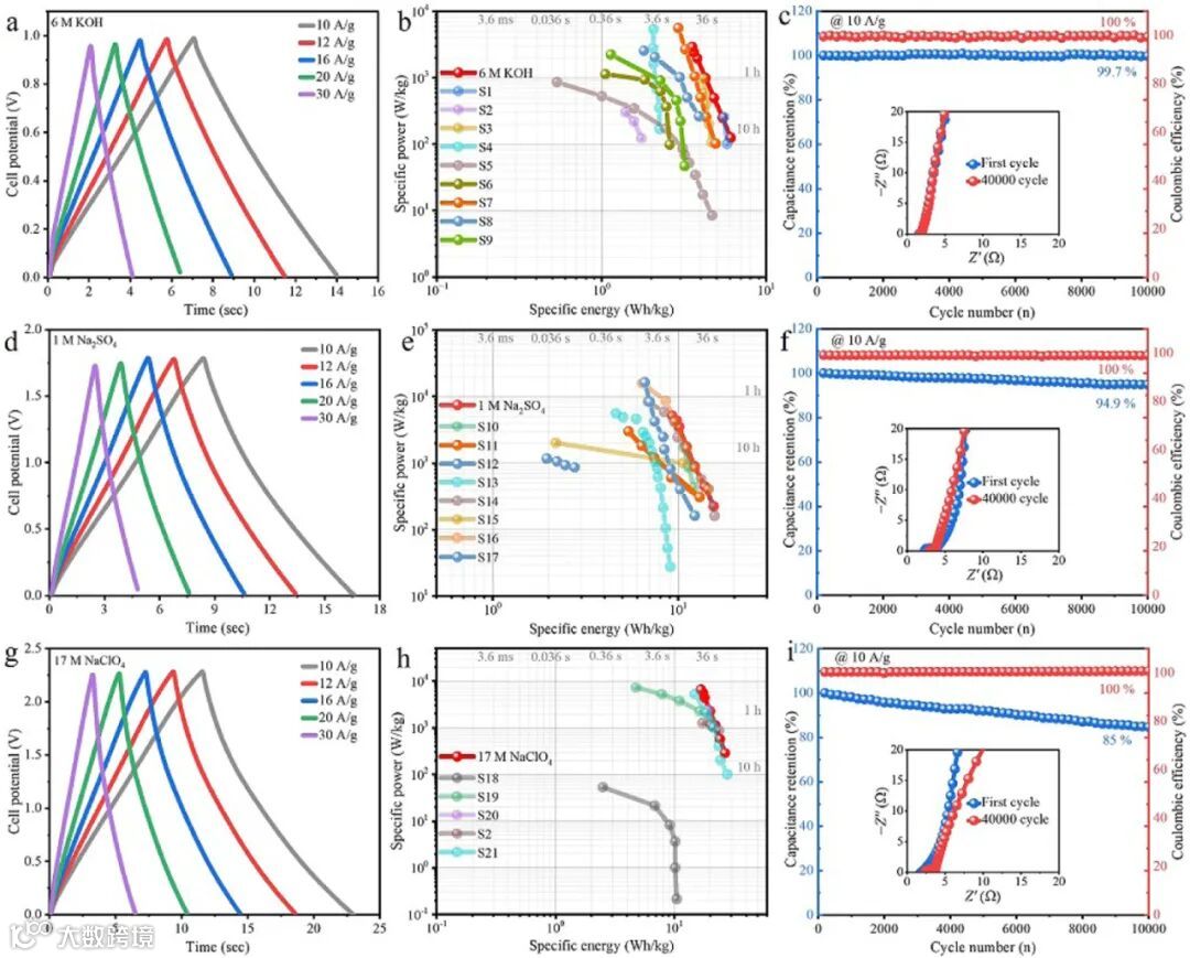 在6 M KOH电解液中,JPC比电容达362.9 F/g(图4a)。组装的对称超级电容器在17 M NaClO₄中工作电压达2.3 V,能量密度为26.7 Wh/kg(图4h),并展现优异循环稳定性(图4i),性能指标居同类材料前列。