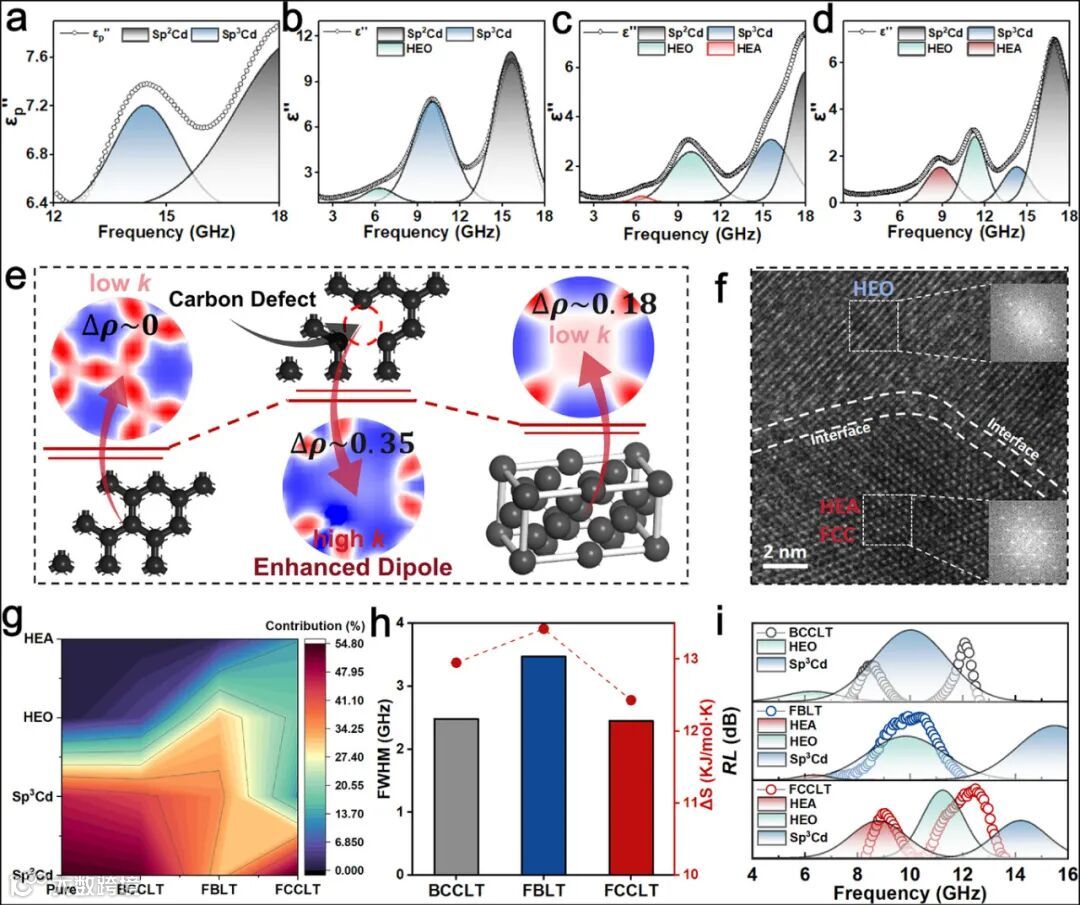 图3分析了多相协同的微波衰减机制。通过Debye弛豫模型区分了四种损耗机制的贡献,发现高熵组态可拓宽弛豫时间分布。HEO和HEA两相的协同作用使材料有效吸收带宽达5.33 GHz,显著优于单相结构。