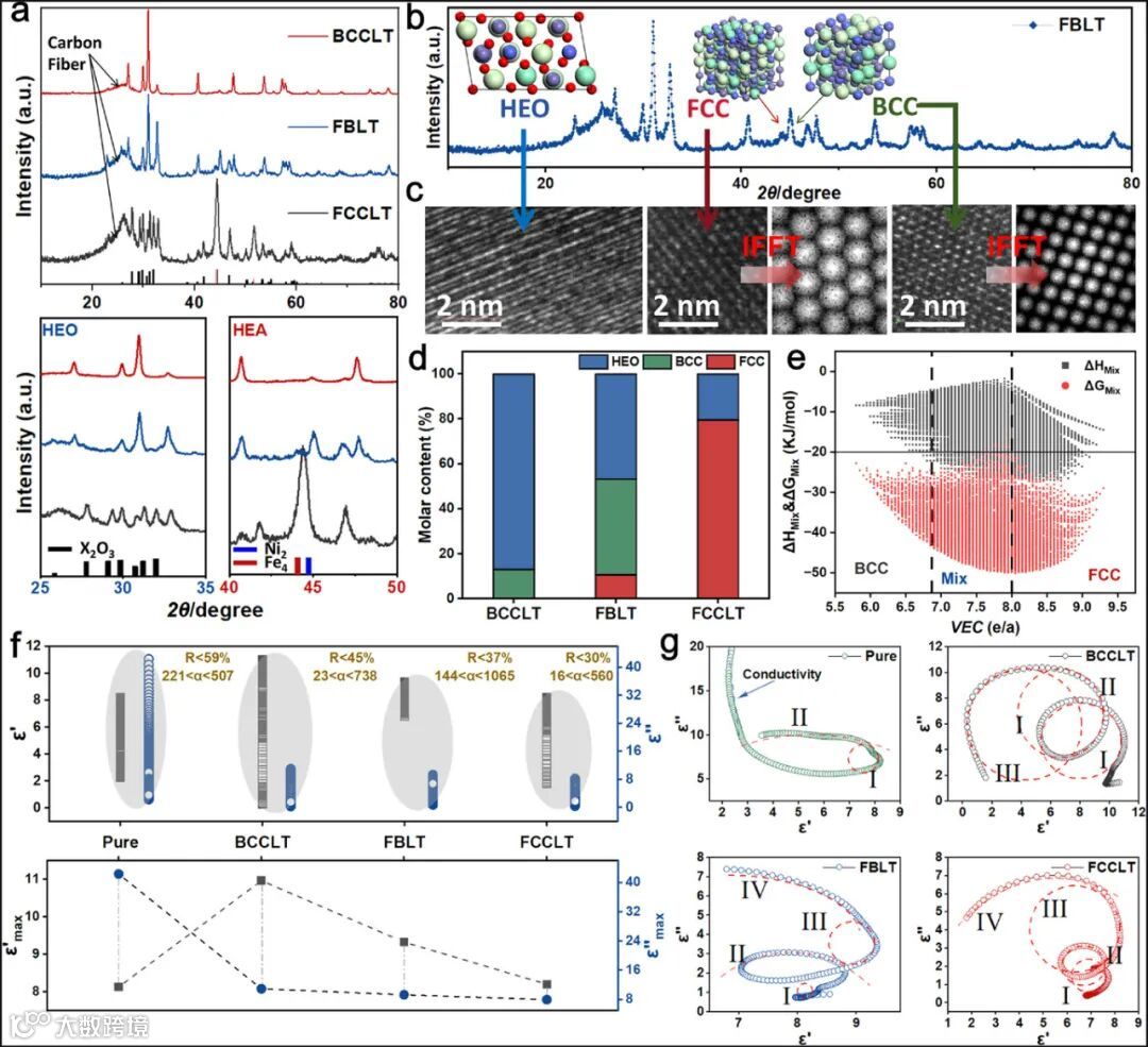 图2揭示了多相结构对电磁响应的调控机制。XRD显示随着稀土含量变化,材料呈现FCC/BCC双相特征,通过调控相组成可精确调节介电性能,最大介电虚部达42.36。Cole-Cole曲线表明多相界面引入多种极化机制,为宽频吸收奠定基础。