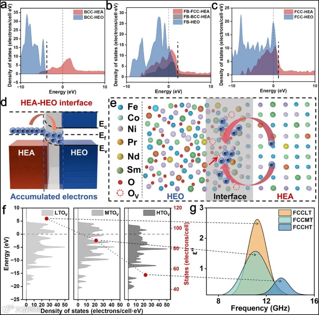 图5通过DFT计算揭示了氧空位的微波衰减机理。发现HEA与HEO在费米能级处的态密度差异驱动界面电荷迁移,氧空位作为电子陷阱显著增强界面极化损耗,其浓度与形成能直接影响弛豫峰位。