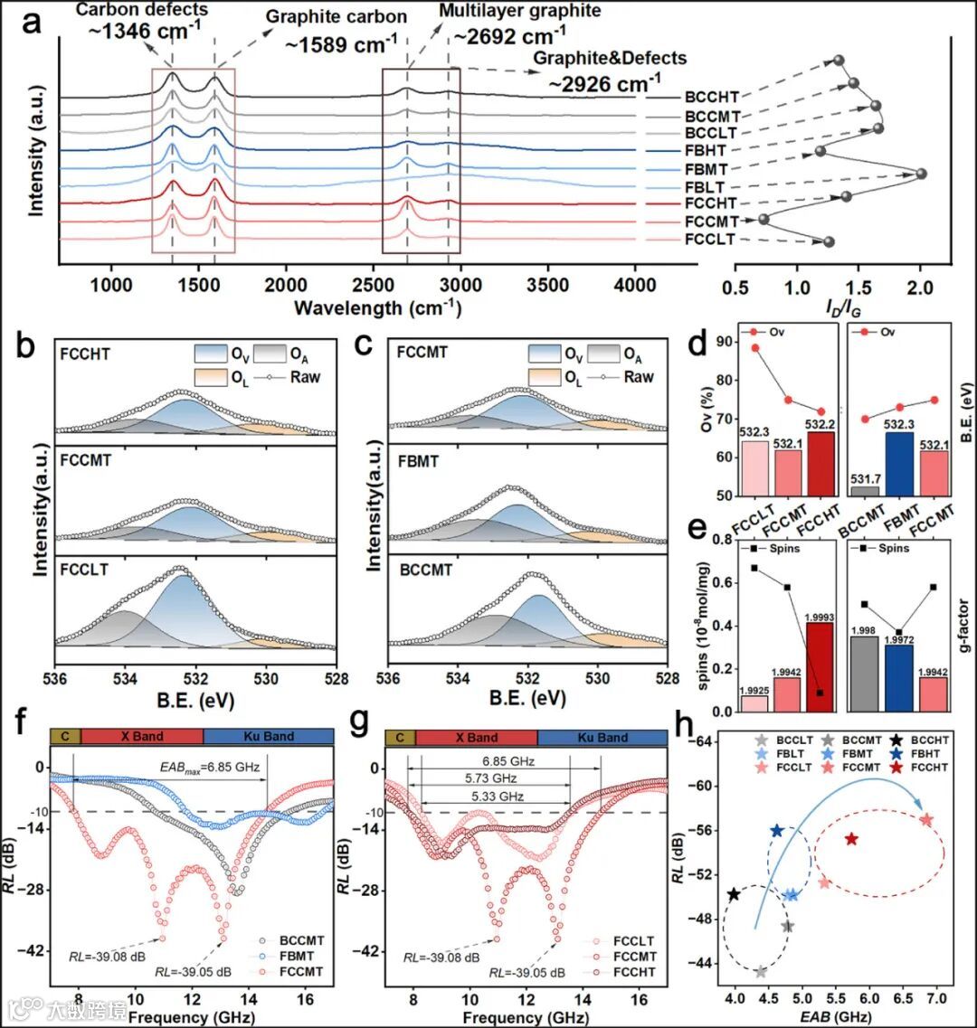 图4展示了碳-氧双缺陷的协同增强效应。通过调控FJH温度实现碳缺陷与氧空位的浓度平衡,最优样品在30%填充量下实现6.85 GHz的吸收带宽和-39.08 dB的反射损耗,具备近完美匹配特性。
