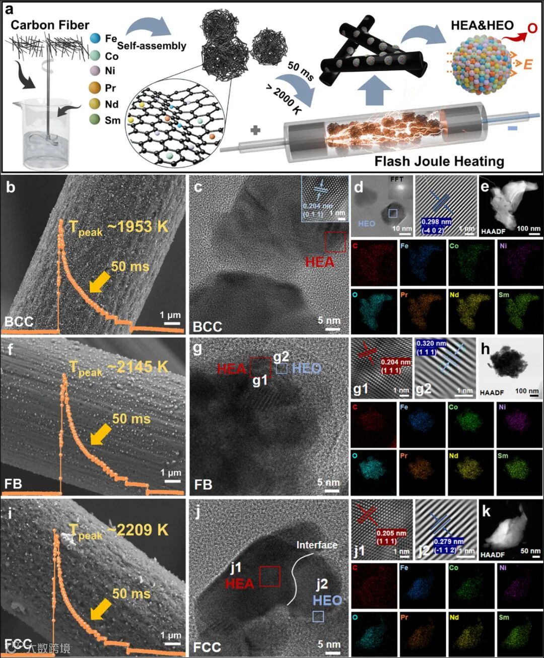 图1展示了材料的制备流程与微观结构。通过"稀土固定-高压分散"策略将六种金属硝酸盐锚定于碳纤维表面,经FJH高温快速处理形成高熵合金和高熵氧化物两相结构。TEM分析显示两相间形成原子级界面接触,为极化弛豫提供了结构基础。