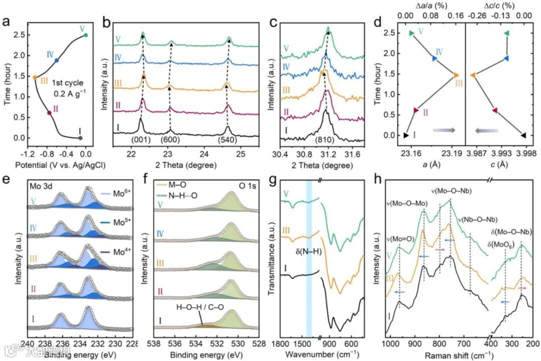 非原位XRD等表征直接观测到NH₄⁺嵌入后,晶格发生各向异性微小变化(a轴膨胀0.16%,c轴收缩0.28%),整体体积应变小于0.1%,实现了真正的“近零应变”存储。XPS与FTIR谱中N–H⋯O氢键信号的出现与消失,直接证实了氢键参与存储过程。