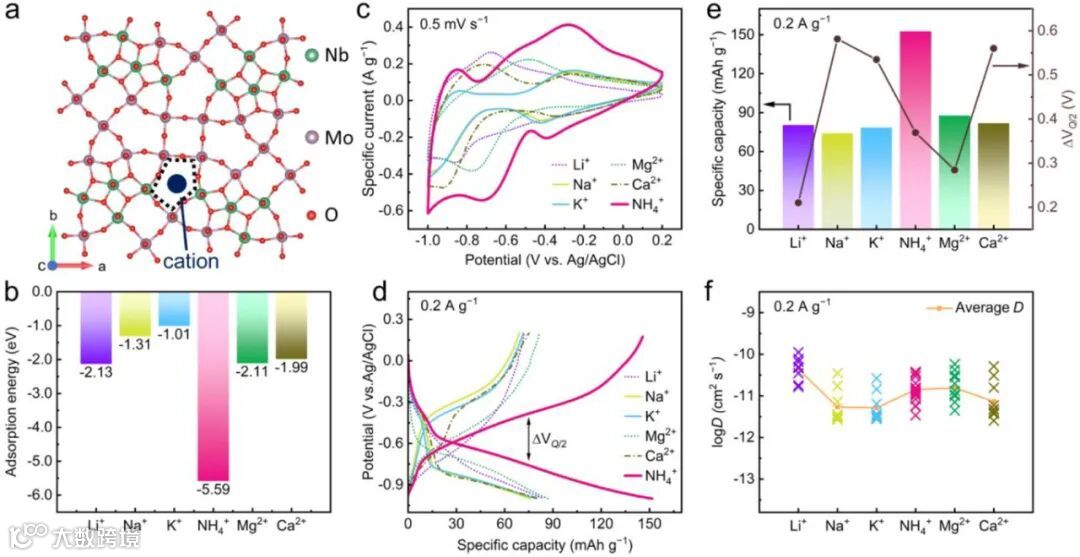 特异性离子存储:DFT计算与实验证明,该三维隧道结构对NH₄⁺具有最低吸附能(-5.59 eV)与最优扩散路径,表现出显著优于K⁺、Mg²⁺等金属离子的存储性能。