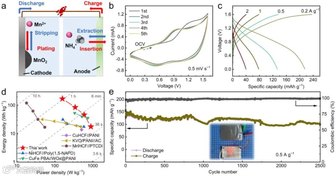 全电池性能卓越:以该材料为负极组装的铵离子全电池,能量密度达171.6 Wh kg⁻¹,在0.5 A g⁻¹下循环2,500次容量保持率95%,并成功点亮LED阵列,展示实用化潜力。